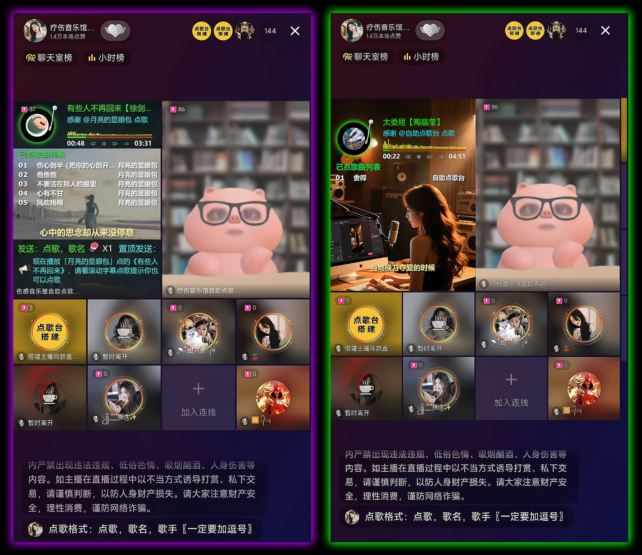 支持礼物或者积分点歌、置顶、切歌、续听、删歌、超级切歌,支持语音播报、文字弹幕播报,支持冷场讲解、礼物感谢、关注感谢、点赞感谢、直播间进人欢迎、关键词自动回复,支持deepseek、阿里云、腾讯云等多个大语言模型智能回复,支持普通用户组、粉丝团用户组、VIP用户组、管理员用户组独立自定义积分,支持横版、竖版、七宫格、九宫格、十宫格模板布局,支持阿里云、腾讯云、百度云三大语音接口,支持几百种男生女生普通话及方言发音模型,支持刷任何礼物召唤火箭、嘉年华、天空之城、宇宙之星、璀璨花海、秘境巡游、十里桃花等绝版震撼唯美特效、支持木鱼计数、音播特效、头像飘屏、贵宾席位